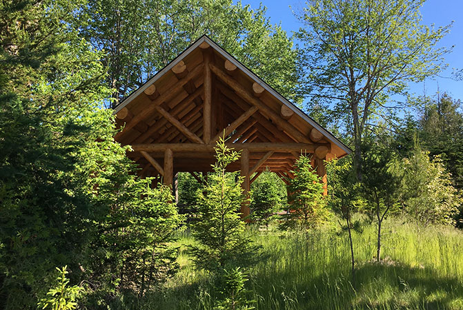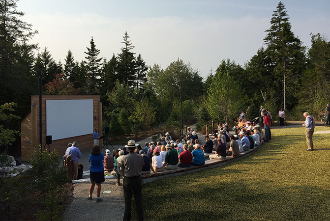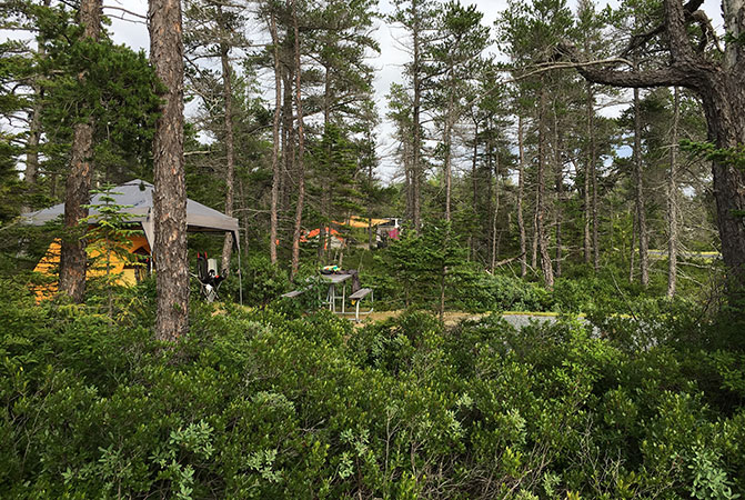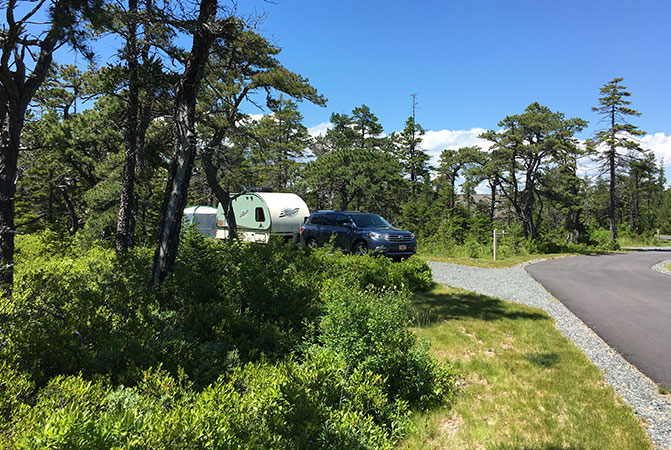 The 100 site campground was designed to create a comfortable and enjoyable camping experience. The density of campsites is lower density than typically found in NPS campgrounds, with a substantial natural vegetated between campsites. The design takes advantage of the natural terrain, with the access roads following to a great extent old logging roads and skidder trails to keep vegetation removal to a minimum. The campground consists of four distinct camping areas or – 33 RV and other large camper sites in one loop; pull behind, 42 van and tent camper sites in another, 2 large group camping sites with a large pavilion at the end of the campground drive, and 12 hike in sites, the only ones in Acadia National Park outside of Isle au Haut. Each loop contains two restroom buildings, with one restroom at group camping and a vault toilet for the hike-in sites.