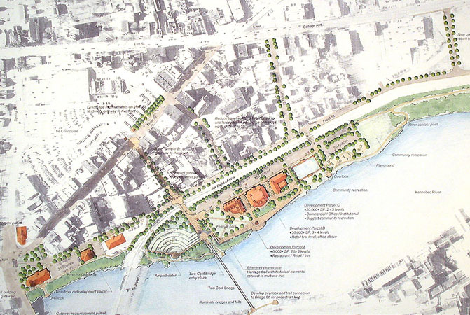 Coplon Associates led a planning team that worked with the city of Waterville to develop a master plan for the redevelopment of an open 22-acre site on the Kennebec River. Located adjacent to the downtown area and connected to neighboring Winslow by the historic Two Cent Bridge, the site offers attractive opportunities for commercial, institutional, and recreational development. The master plan was conceived to promote downtown redevelopment and foster greater public access to the riverfront. The plan identifies development parcels totaling 60,000 square feet, and public spaces that include an amphitheater, festival park, riverside promenade and community recreation facilities.